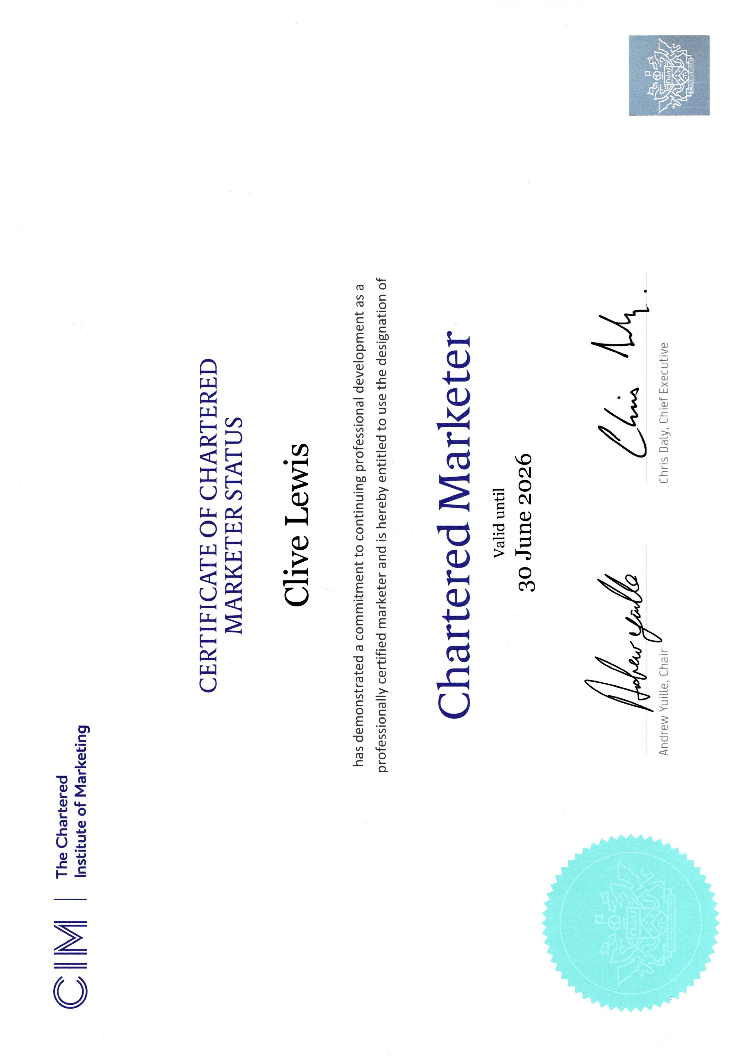 Clive is a Fellow of The Chartered Institute of Marketing and holds a Distinction grade MA in Marketing from a top university. He is also a qualified Six Sigma practitioner and facilitator.
